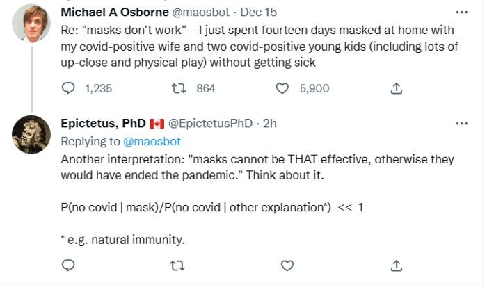 What’s even more baffling is that he caught covid back in 2020 and rather than ascribe the “miracle” of not catching covid again to, oh I don’t know, that mystical thing known as immunity, he ascribes it to his mask. It’s not clear from his tweet whether his family masked up too, but the implication from the tweet is that he’s talking about the (very) alleged protective value of his mask, and not masks as source control.