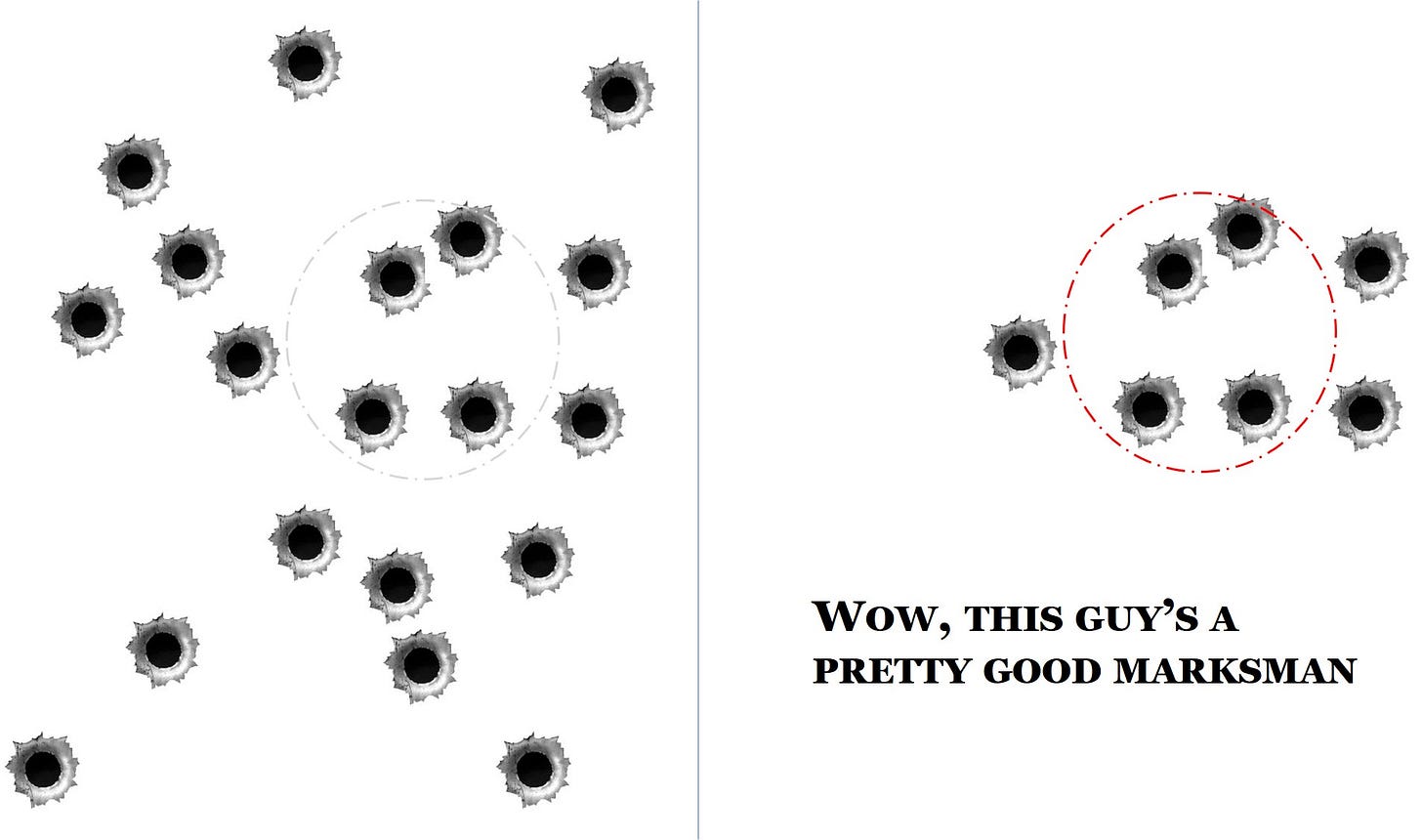 What the prosecution did in their attendance chart was to focus only on those deaths they wanted to pin on Letby. It’s a bit like this where the target (in red) is drawn afterwards (the grey circle on the LHS is included as an aid to the eye, but not originally there) :