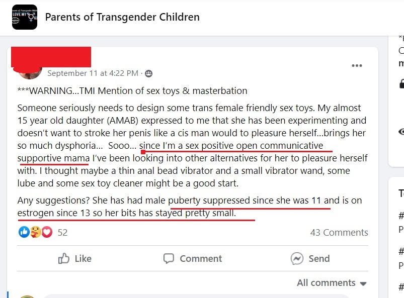 The following tweets are screenshots of a support group for parents of trans kids. This is not really a trans issue, but more of a question of parenting. I’ve just picked out 3 but you can read the whole lot here. They more or less speak for themselves.
